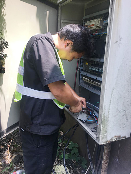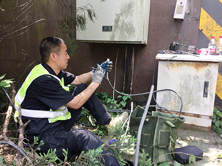 圖為修復(fù)后的隧道口路燈 對(duì)于修復(fù)被盜電纜,一般最直接的做法是重新再拉一根新電纜至配電箱,利用箱內(nèi)現(xiàn)成的控制開(kāi)關(guān)和交流接觸器等元器件,完成整個(gè)電纜連接工作,但中心隊(duì)員考慮到此種方法不僅工作量大,修復(fù)成本高,而且存在再次被盜的可能性,如果用鋁線代替,電力傳輸又要大打折扣。于是,他們另辟蹊徑,計(jì)劃從剩余配電箱至路燈還有200余米未被盜取的電纜中截取一段,直接和洞口情報(bào)板電纜相接,這樣既能節(jié)省人力、物力,又能以最快速度恢復(fù)路燈正常工作。 當(dāng)天一早,中心隊(duì)員帶上相應(yīng)的工具和設(shè)備直奔現(xiàn)場(chǎng),在確認(rèn)電纜位置及走向后,便著手抽離洞內(nèi)電纜。考慮到洞口到配電箱電纜至少有100余米,電纜溝下面又鋪有其他眾多電纜以及之前掉落的垃圾,直接從洞口抽離根本無(wú)法動(dòng)彈。于是,中心4名隊(duì)員便每隔10米左右用撬棍撬開(kāi)上面水泥蓋板,整個(gè)人跳進(jìn)電纜溝內(nèi),彎著腰一段一段抽離。抽到最后一個(gè)溝時(shí),4人頂著烈日,齊力把重達(dá)近百斤電纜抽離整個(gè)電纜溝并放置在護(hù)欄內(nèi)側(cè)草地上,隨后再?gòu)某槌龅倪@段電纜中剪取適當(dāng)長(zhǎng)度,重新鋪設(shè)后與寧向出洞口的情報(bào)板電纜相接。 臨近中午,戶外溫度不斷升高,中心隊(duì)員早已濕透衣背,為趕在一天中最熱的時(shí)間點(diǎn)前完成任務(wù),4名隊(duì)員臨近解決午餐又迅速奔赴現(xiàn)場(chǎng),拆除原配電箱內(nèi)的舊器件,將其用回到新的供電線路中,而多余的器件則捆綁打包帶回中心以留備用,節(jié)省公司后期維養(yǎng)成本。 下午1:40,經(jīng)過(guò)通電測(cè)試,9盞路燈全部恢復(fù)正常工作。集團(tuán)總工程師江輝在工程部微信群里肯定了中心工作,并提醒一線人員切記做好防暑降溫工作,注意自身身體狀況。