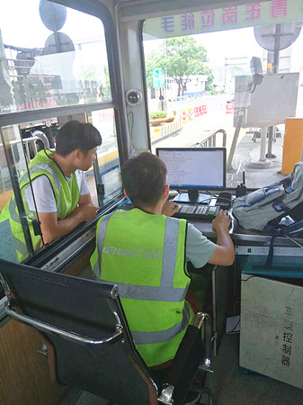 圖為工作人員對(duì)天線(xiàn)聯(lián)調(diào)測(cè)試 8日9日中午1點(diǎn)30左右,正是一天中最熱的時(shí)間,天線(xiàn)廠家?guī)еO(shè)備來(lái)到收費(fèi)所,中心人員便放棄午休時(shí)間和早已在外廣場(chǎng)待命登高車(chē)駕駛員一起,協(xié)助廠家技術(shù)人員更換離地面6米余高的RSU天線(xiàn)盒。由于天線(xiàn)盒上方?jīng)]有安裝任何遮擋設(shè)備,長(zhǎng)年日曬雨淋導(dǎo)致上方固定螺栓都出現(xiàn)生銹打滑,拆卸難度徒增,不到十分鐘,我們工作人員便濕透了全身,但大家還是咬咬牙,為盡快恢復(fù)車(chē)道正常行駛,保證車(chē)道便捷暢通而繼續(xù)埋頭苦干。在經(jīng)過(guò)近一個(gè)小時(shí)努力,終于將新的天線(xiàn)盒成功安裝,最后經(jīng)過(guò)聯(lián)調(diào)測(cè)試,恢復(fù)了車(chē)輛正常讀卡。 通過(guò)對(duì)新天線(xiàn)盒“上任”后數(shù)天觀察,發(fā)現(xiàn)該ETC車(chē)道讀卡失敗率明顯下降,車(chē)輛通過(guò)率達(dá)到了99.7%。如此一來(lái),大大提高了車(chē)輛通行效率,距打造“智慧高速”目標(biāo)又邁進(jìn)了一步。