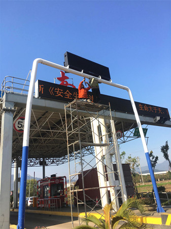 圖為工作人員正在安裝新的可變情報(bào)板