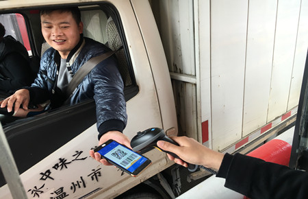圖為臺(tái)州高速公路支付寶移動(dòng)支付通行費(fèi)第一輛車(chē)的車(chē)主接受媒體采訪