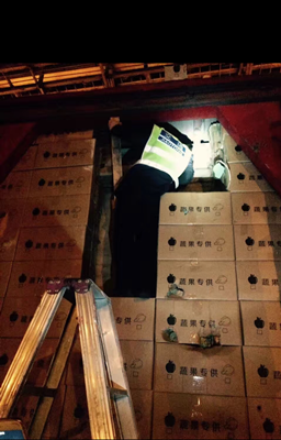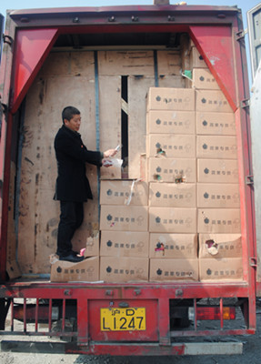 一張照片牽出一輛假冒“綠農(nóng)車” 3月1日凌晨,車號(hào)為滬DL1247的廂式大貨車因假冒綠農(nóng)車在臺(tái)州收費(fèi)所被設(shè)卡攔截,司機(jī)因涉嫌詐騙被公安機(jī)關(guān)帶走調(diào)查。 這輛從溫州南入口、車門上印著“蔬果特快”軸限40噸的115型大貨車,在凌晨2:25分駛?cè)肱_(tái)州收費(fèi)所,司機(jī)自稱運(yùn)送蘋果。當(dāng)檢查人員打開車廂后門,搬開疊放著兩層的蘋果箱后,發(fā)現(xiàn)廂體另有天地,一個(gè)用鐵條焊成的架子沿著廂壁固定在廂體內(nèi)部,架子上豎著兩大片木板,木板遮擋了廂體六分之五的面積,透過(guò)木板縫隙能看到里面一箱箱的貨物。檢查人員把手伸進(jìn)包裝箱里,拆開一看,里面全是電動(dòng)車的配件。