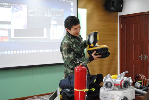 專題講座上,褚隊長仔細講解了火災基本常識、火災形勢、火災成因分析和消防報警等注意事項,發(fā)生火災后的自防、自救、逃生技能,同時結合近年發(fā)生多起重大火災事故新聞報道視頻,圖文并茂講解了事故發(fā)生的原由及所造成的危害情況。講解完實例之后,褚隊長又按種類、功能分類,分別介紹了消防員的各類裝備。
