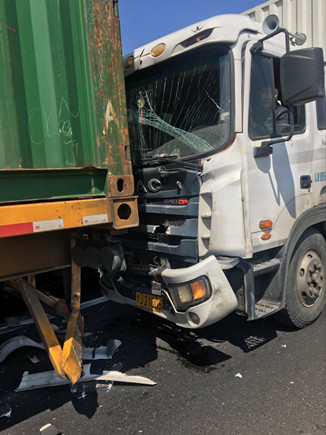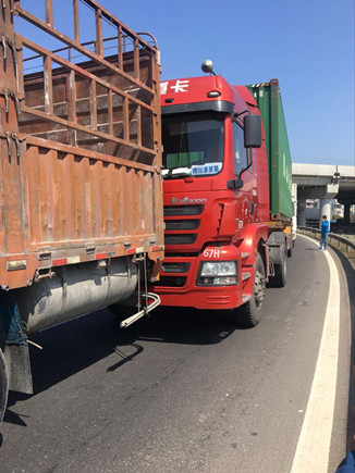 當(dāng)天中午,在副站崗?fù)づ哉镜墓ぷ魅藛T發(fā)現(xiàn)該所前方出口不遠(yuǎn)處有貨車停在那里不動(dòng),以致后面車輛無法通行。工作人員隨即跑到前方查看情況,原來是三輛貨車發(fā)生追尾,其中有一輛車車頭被撞得凹陷,擋風(fēng)玻璃也被撞碎,在了解事故現(xiàn)場無人員受傷后,工作人員馬上向監(jiān)控中心匯報(bào)情況。由于事故車輛較大面積滯留,導(dǎo)致后方車子堵到主線上,一些不明情況的駕駛員在車?yán)锸箘虐蠢却叽伲F(xiàn)場充滿焦躁情緒。