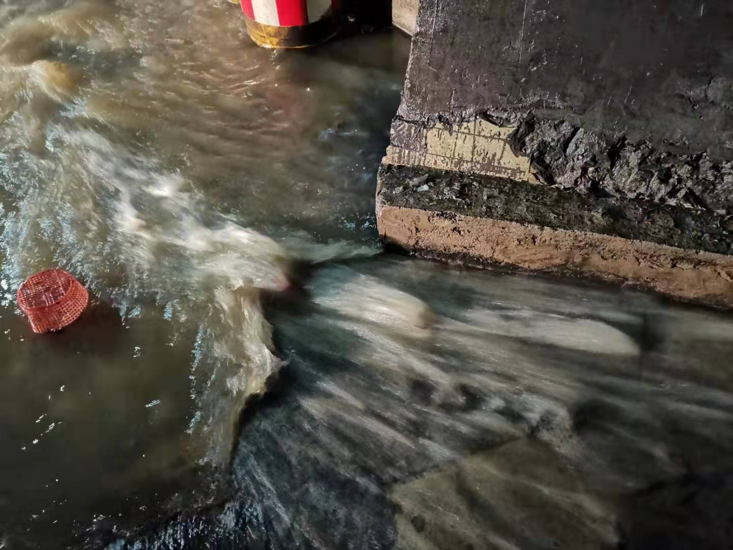 圖為車道水流 當(dāng)晚19:12分,黃土嶺隧道所中控員徐彤霞發(fā)現(xiàn)寧向隧道主車道路面出現(xiàn)積水,如不及時(shí)處置,路面濕滑會(huì)讓過(guò)往車輛打滑,嚴(yán)重影響隧道的安全暢通。為了杜絕安全隱患,管理所立即啟動(dòng)防汛應(yīng)急方案,中控員第一時(shí)間在管理群發(fā)送現(xiàn)場(chǎng)圖片,并在同一時(shí)間通知執(zhí)勤隊(duì)與監(jiān)控中心。 執(zhí)勤隊(duì)員不顧狂風(fēng)暴雨趕赴現(xiàn)場(chǎng),19:19分,斜井現(xiàn)場(chǎng)山上倒灌入隧道的水嘩嘩直流,儲(chǔ)水池水流急促,執(zhí)勤隊(duì)員立即分工合作,一組在主車道擺放安全錐采取防護(hù)措施,并利用沙包,堵住排水溝壁,使水盡量不往外滲,及時(shí)避免了積水對(duì)隧道內(nèi)行車造成的安全隱患。一組檢查潛水泵是否正常運(yùn)行,查看積水入侵的原因、排水溝通暢情況。