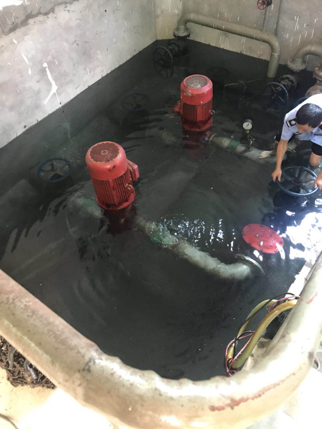 圖為執(zhí)勤隊員在關(guān)閉閥門 “看,應該是這里漏水了,有水暈在動?!?/span> “對,就是這里了。” “水馬上要沒到電機了,趕快關(guān)閉閥門,不然損失就大了?!?/span> 此時,陳旦平?jīng)]有多想,立即下水去關(guān)閉水泵閥門。池中有2號泵的高位水池閥門和2號泵的集水池閥門,每個泵各有兩個閥門。陳旦平在迅速關(guān)閉閥門后,由于集水池這邊地勢較低,慌忙中的他忘拿手機,手機被水浸到,他卻依舊埋頭于搶修。 據(jù)隊長李新波說,此次“水災”是北泵房2號泵的壓力表處水管漏水,原因是設備設施使用時間較長,水管陳舊銹蝕,抵不住水壓,導致水管開裂,引起漏水。 胡瑰華