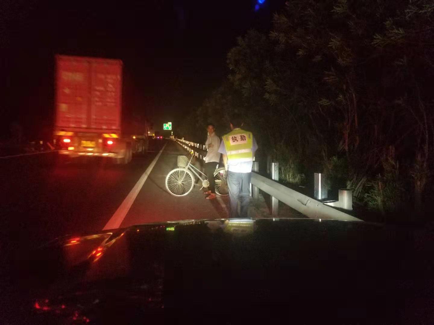 9242109,大溪嶺隧道所中控室發(fā)出通知。執(zhí)勤隊(duì)員接中控指令,迅速出警。晚上九點(diǎn),在高速公路上找人,需得打上12分的精神,巡邏車放慢車速,坐于后座的隊(duì)員們緊盯著車道兩旁,終于在2114分,距離寧向隧道出口一公里處發(fā)現(xiàn)該騎車男子,隊(duì)員們立即上前將其攔住。眼前的一幕令執(zhí)勤隊(duì)員嚇出一身冷汗,該男子左手殘疾,單手騎車,晚上視線模糊,且高速公路車多,速度快,司機(jī)很難發(fā)現(xiàn)有行人,如發(fā)現(xiàn)躥出來的行人而采取緊急制動,會造成多起追尾事故,現(xiàn)場情況非常危險(xiǎn)!隊(duì)員們合力將自行車抬上車。