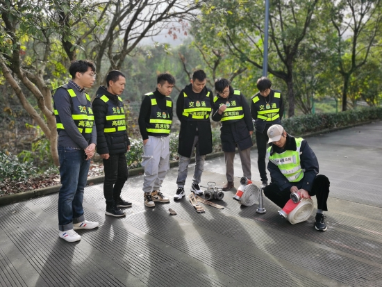圖為陶文輝在教樂清公司員工如何進(jìn)行水帶操作 本次培訓(xùn)對(duì)隧道預(yù)警流程、二帶連接及執(zhí)勤隊(duì)在平時(shí)巡邏、預(yù)警、處理事故中如何確保自身安全等進(jìn)行重點(diǎn)講解。執(zhí)勤隊(duì)長帶領(lǐng)隊(duì)員們?cè)诠芾硭賵鲞M(jìn)行模擬主線卡口、事故拋錨車預(yù)警封道操作,樂清公司員工觀摩之后也進(jìn)行實(shí)際操作,孫鵬詳細(xì)講解擺放隔離錐應(yīng)注意事項(xiàng),每一隔離錐的間隔位置、巡邏車后方擺放的安全距離,事故處理之后,收隔離錐應(yīng)注意的安全動(dòng)作。陶文輝為樂清公司員工演示“二帶連接”,并對(duì)水帶的甩、接、收每一動(dòng)作盡可能詳細(xì)仔細(xì)地進(jìn)行解說示范。
