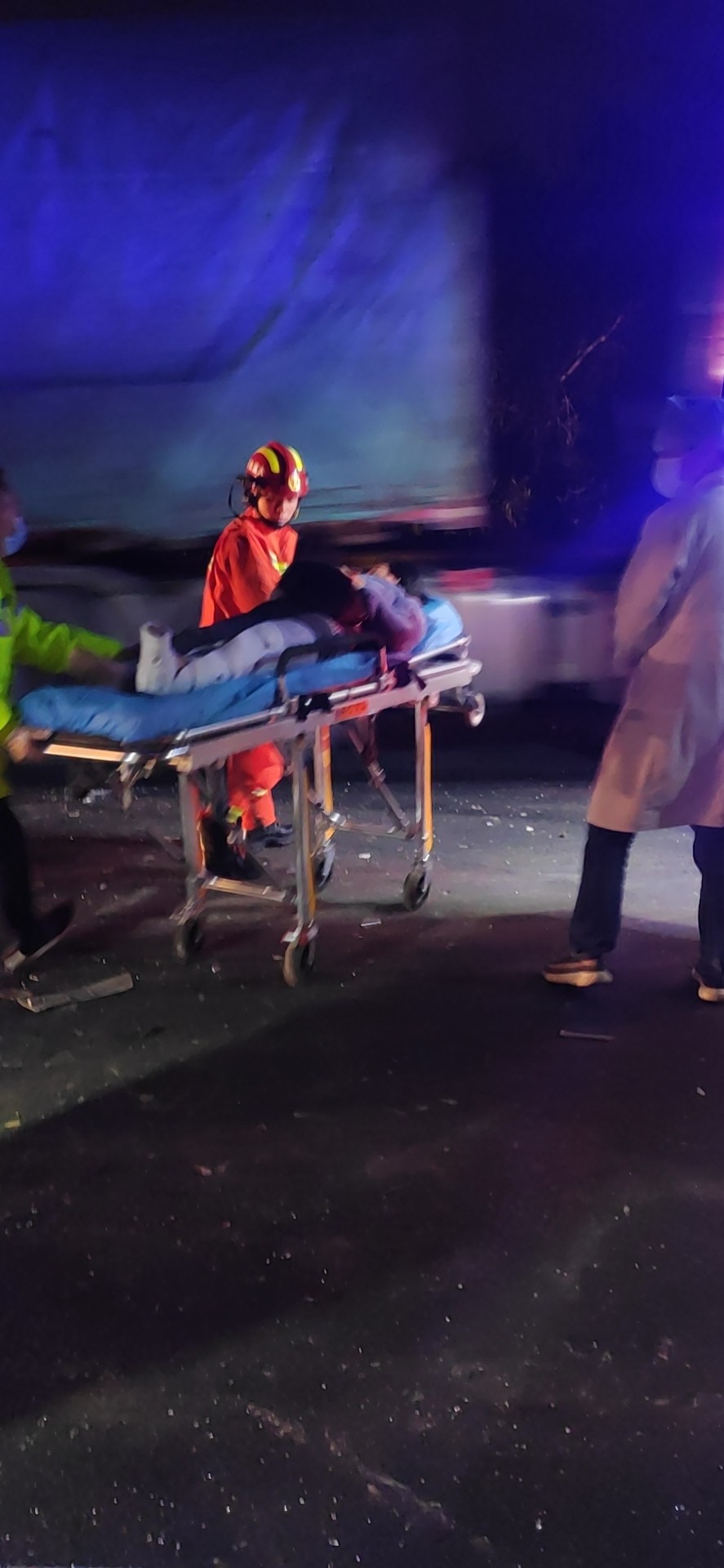 21:50巡邏車和消防車同時(shí)到達(dá)現(xiàn)場,隊(duì)員陳幸飛快的跑下來,以百米沖刺的速度做好巡邏車的安全措施和預(yù)警工作,有3人受傷,事故車頭已嚴(yán)重變形,一名女性腰部受傷坐在地上,語速正常,思維清晰。還有二名人員被卡在駕駛室,消防隊(duì)員正在查看現(xiàn)場準(zhǔn)備施救,受傷人員哭爹喊娘嚎聲不斷,由于救護(hù)車還沒達(dá)到現(xiàn)場,陳幸在事故車后方硬路肩上維護(hù)秩序,防止車輛占道,并同時(shí)迎接救護(hù)車,湯寧光則在維護(hù)現(xiàn)場秩序,阻止其他司機(jī)圍觀影響救援。 22:00第一輛救護(hù)車到達(dá)。醫(yī)護(hù)人員準(zhǔn)備擔(dān)架,另一名醫(yī)生去詢問坐在地上的受傷人員,由于車頭嚴(yán)重變形,司機(jī)與鄰座的人都被卡在駕駛室,經(jīng)過消防員的救援,受傷最嚴(yán)重的司機(jī)首先被救了下來,在被救下的那刻暈了過去,醫(yī)護(hù)人員立該把傷員抬上救護(hù)車,緊接著消防員救下第二位被卡傷員,第二輛救護(hù)車帶著傷員離開,最后一輛救護(hù)車卻遲遲沒到,經(jīng)聯(lián)系監(jiān)控中心后得知救護(hù)車已上高速,但因后方車輛太多,救護(hù)車和拖車都被堵了,經(jīng)和臺(tái)州高速交警協(xié)商后,最后清理一個(gè)車道讓救護(hù)車和拖車先開上來,巡邏車去事故車后方預(yù)警,22:30救護(hù)車帶走最后一名傷員,事故車被拖走,路面恢復(fù)正常通車。