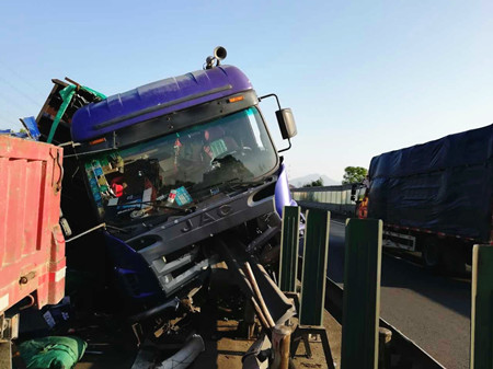 現(xiàn)場(chǎng),事故車輛占據(jù)整個(gè)超車道和半個(gè)主車道,因此造成后方嚴(yán)重堵車。施救中心在接到報(bào)警后迅速出動(dòng),不僅配合警車在現(xiàn)場(chǎng)預(yù)警,而且想辦法盡快將事故車輛拖離車道,以免造成二次事故。隨后,養(yǎng)護(hù)部門(mén)到達(dá)現(xiàn)場(chǎng)清理。經(jīng)過(guò)5個(gè)多小時(shí)奮戰(zhàn),40多人的合力處理下,道路終于恢復(fù)了暢通。