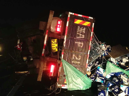 8月25日凌晨4點(diǎn),甬臺(tái)溫高速溫向1648+7路段,一輛運(yùn)啤酒的大貨車因司機(jī)疲勞駕駛,導(dǎo)致車輛撞上中央護(hù)欄而側(cè)翻,啤酒灑滿一地,后方兩輛貨車避讓不及造成多車事故。