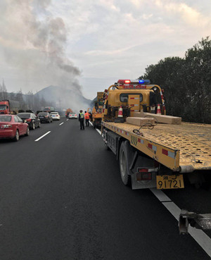 事態(tài)緊急,刻不容緩,清障車立即拉響警報預(yù)警,迅速提速超過事故車,指引該車轉(zhuǎn)入應(yīng)急車道避免二次事故。由于該車運載易燃品,天氣晴好,火勢借東風(fēng)迅速變猛,無法直接現(xiàn)場救援,事故車駕駛員已經(jīng)手忙腳亂。施救中心工作人員立即緊急上報指揮中心請求消防車支援。中心“2+1+n” 快速應(yīng)急模式隨即馬上啟動,17:30分在中心待命的施救車也到達(dá)現(xiàn)場配合預(yù)警,保持事故現(xiàn)場另一車道暢通,不影響其他車輛安全通行。 17:40分消防車到達(dá)現(xiàn)場滅火,18:15火滅,清障車帶事故車離開現(xiàn)場。從發(fā)現(xiàn)到處置完畢僅1小時,無人員傷亡,高速公路也一直保持安全暢通。 童軍偉
