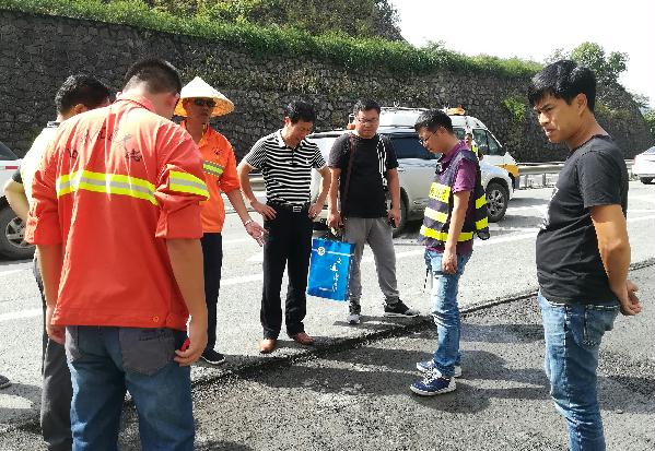 圖為集團總工程師江輝與相關(guān)人員在現(xiàn)場協(xié)商病害處置方案 根據(jù)施工方反應(yīng),臨海南匝道段瀝青路面病害較為嚴重,江輝一行即刻邀請路面專項工程設(shè)計方共同到現(xiàn)場,仔細檢查瀝青路面病害情況,并根據(jù)病害程度,裂縫、車轍等情況協(xié)商確定相應(yīng)的專項處置方案,以便更好地開展路面維修工作。