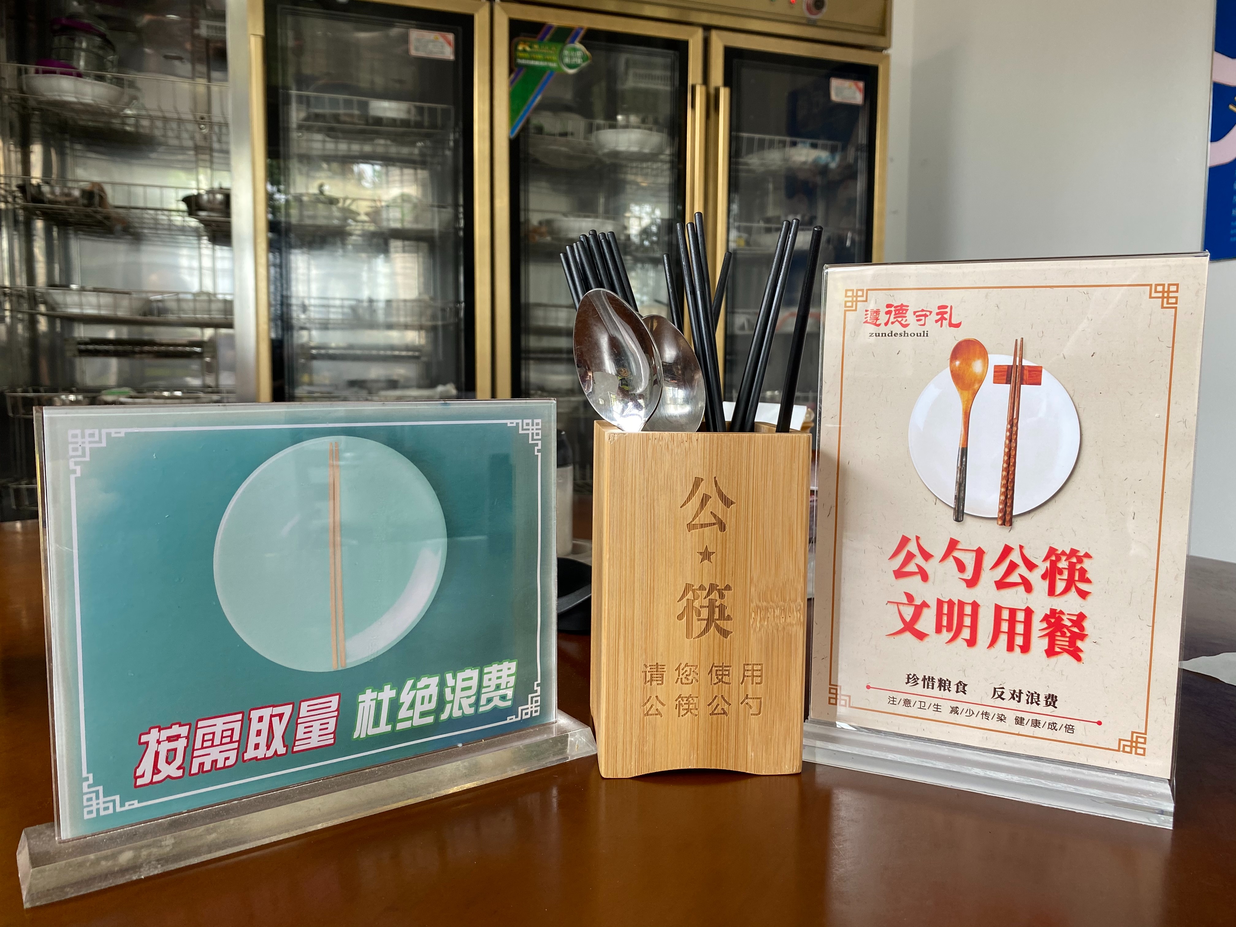 該所通過食堂粘貼宣傳畫、餐桌放置宣傳標(biāo)牌、設(shè)置公用筷子筒等多種方式進(jìn)行廣泛宣傳,以此提升“反對(duì)浪費(fèi)、公筷公勺、文明健康”的活動(dòng)知曉率,促進(jìn)全體員工積極參與,引導(dǎo)員工自覺杜絕“舌尖上的浪費(fèi)”。