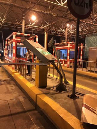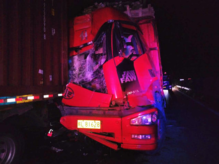 圖為被撞壞的ETC設(shè)備 當(dāng)晚事故接連不斷。晚上22點(diǎn)40分,臺(tái)州收費(fèi)所ETC進(jìn)口處,一輛大客車(chē)行李車(chē)門(mén)撞歪顯示屏,同時(shí)也撞壞了一只抓拍攝像頭,造成了較大的路產(chǎn)損失,但是當(dāng)班員工都正在路面上施救,施救中心領(lǐng)導(dǎo)統(tǒng)籌部署,通知兩位在所非當(dāng)班人員赴崗上班,緊急出動(dòng),發(fā)揮連續(xù)作戰(zhàn)精神,進(jìn)行及時(shí)處理。 當(dāng)以上事故處理完畢,施救人員正準(zhǔn)備往回趕的時(shí)候,當(dāng)晚23點(diǎn)10分左右,四輛大貨車(chē)在寧向1667K+300M處連環(huán)追尾,其中一輛紅色大貨車(chē)車(chē)頭嚴(yán)重變形并且不斷向外漏油?,F(xiàn)場(chǎng)極不安全,情況危急,施救中心員工馬不停蹄,又一次拉響了救援車(chē)的警報(bào),為了爭(zhēng)取時(shí)間,甚至通知了另外地點(diǎn)待崗的人員火速趕來(lái),以便能及早處理。此時(shí),施救中心當(dāng)班人員已經(jīng)全體出動(dòng),全部戰(zhàn)斗在路上。 王凱