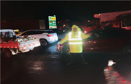 收費(fèi)員汪洋冒雨沖進(jìn)廣場,沉著冷靜指揮車輛有序進(jìn)入車道,此時,駐勤人員紛紛出來協(xié)助指揮交通,迷亂雨霧中指揮秩序的熒光黃反光背心就是司乘人員的航標(biāo),指引著車輛有序平穩(wěn)地通過收費(fèi)站出口。