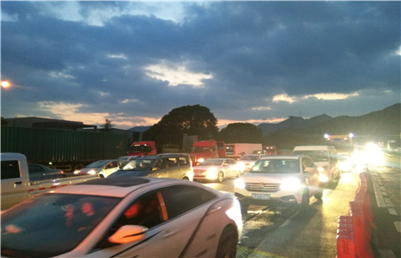3月4日驚蜇雷鳴,大雨瓢潑,大批車輛涌向溫嶺西收費(fèi)所出口。