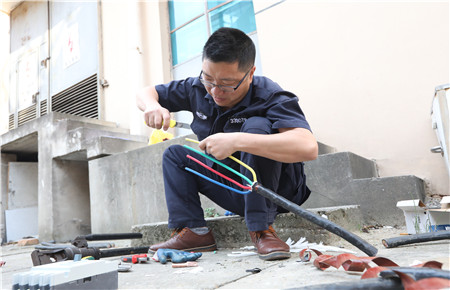 臺(tái)州收費(fèi)所倉(cāng)庫(kù)前方的空地,電工操作的選手們一字排開(kāi),他們熟練地用電工刀,在電纜上輕輕一劃一轉(zhuǎn),整個(gè)絕緣外殼立馬脫離,緊接著去鉛皮、掰角度、壓接頭,不到10分鐘,一根三相四線電纜接頭就此制作完成了。