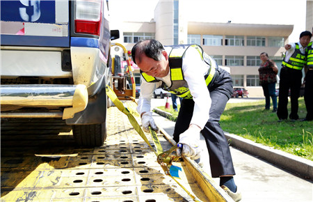 當(dāng)哨聲響起時(shí),清障作業(yè)的考試開(kāi)始了。就象聽(tīng)到路上事故的指令,選手們飛快躍上清障車(chē),趕到“現(xiàn)場(chǎng)”,一組兩名員工,一名快速擺放隔離筒進(jìn)行預(yù)警,一名趕到“事故車(chē)”前進(jìn)行背拖拖曳作業(yè),綁帶作業(yè)、固定輪胎,甚至警燈、檔位、手剎、安全帶、巡視事故車(chē)等細(xì)節(jié)也有具體要求,雖然上午天氣涼爽,可因?yàn)楸荣惖乃俣缺绕磁c現(xiàn)場(chǎng)緊張的氣氛,選手們額頭都冒出了熱氣。