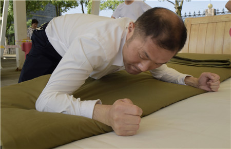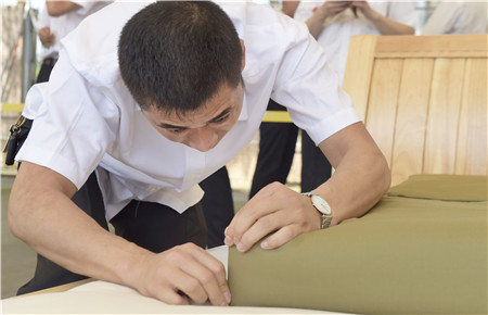 教官用手量量被子上下厚度,四周細(xì)細(xì)觀察,在兩床“豆腐塊”被子之間反復(fù)來回查看了幾遍,又與另一個(gè)教官指指點(diǎn)點(diǎn)商量了好久,不僅是參賽者,圍觀者都開始緊張了。確實(shí),按照內(nèi)務(wù)整理要求,這兩床已被疊成豆腐塊的被子折得有棱有角,被面光滑,上下勻稱,外行人看來就是一模一樣的完美,沒有任何區(qū)別了?!白屗麄兌紩x級(jí)吧?!迸杂^者說。教官笑著搖搖頭,對(duì)大家解釋道:“3號(hào)床勝出,因?yàn)樗请p面折法,在規(guī)定時(shí)間內(nèi)兩面修整程度都一樣平整,這樣比起來,5號(hào)床稍遜一籌?!?/span>