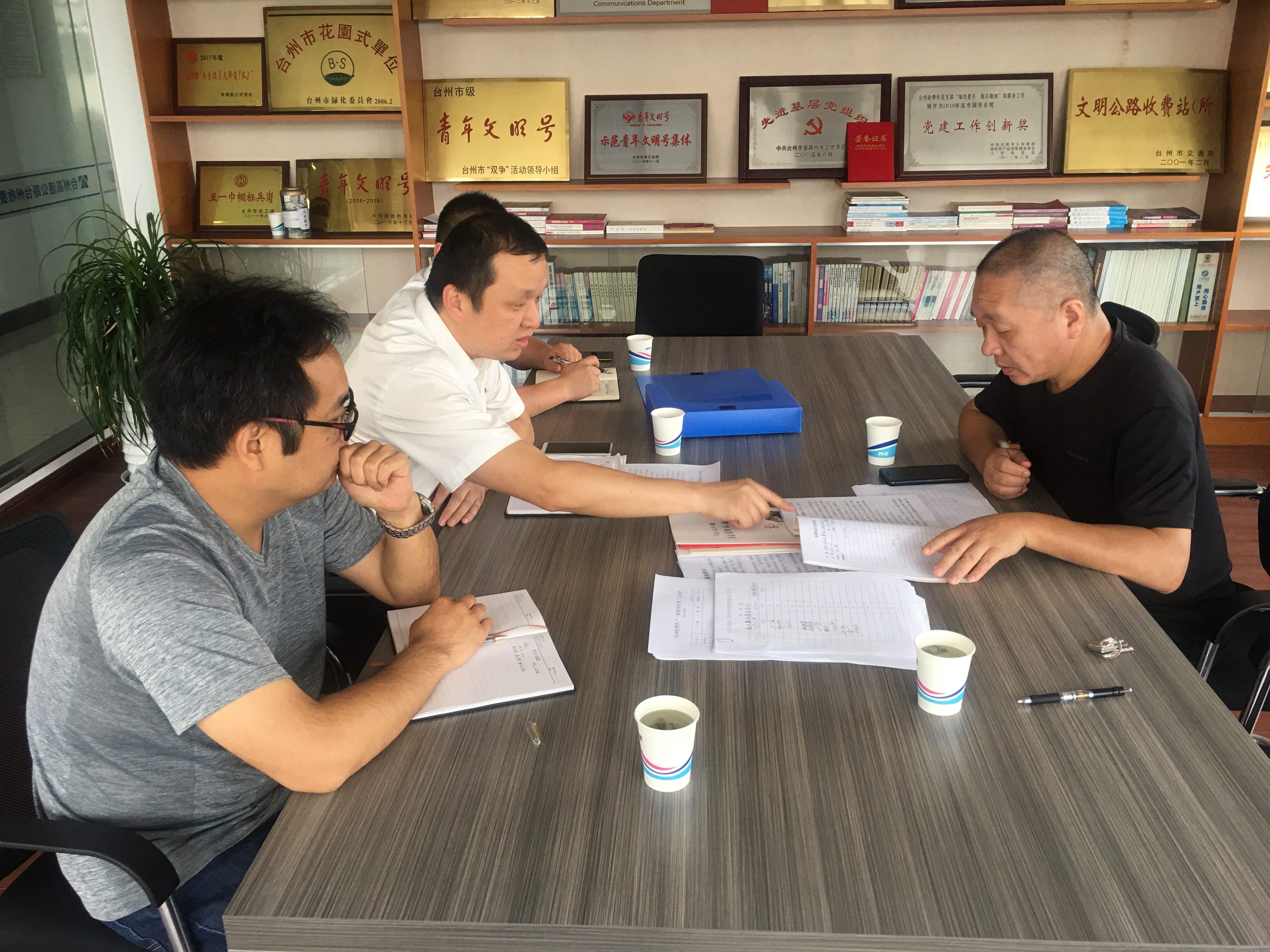 圖為檢查組在臺州收費所檢查 本次檢查以年初簽訂的《黨風(fēng)廉政建設(shè)責(zé)任書》和新出臺的《集團公司黨風(fēng)廉政建設(shè)責(zé)任制檢查考核辦法》為依據(jù),以廉政教育開展頻率及支部書記上廉政黨課完成情況為重點,通過聽取責(zé)任人工作情況介紹、翻閱相關(guān)工作臺帳資料等形式,查證黨風(fēng)廉政建設(shè)責(zé)任實際落實情況。