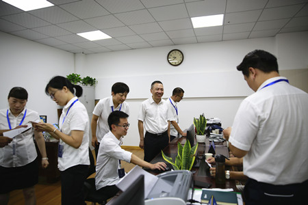 圖為集團(tuán)副董事長(zhǎng)、總經(jīng)理張建平在臨海股權(quán)收購(gòu)點(diǎn)檢查工作人員業(yè)務(wù)操作