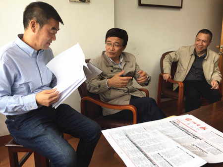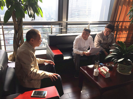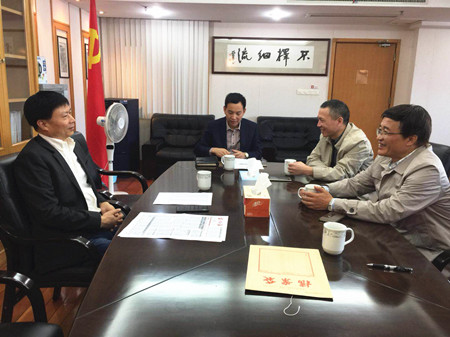 圖為市國(guó)資委主任徐豪和集團(tuán)總經(jīng)理張建平一起走訪市財(cái)政局股東單位