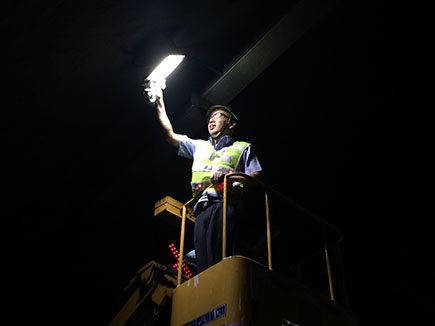 因隧道內(nèi)車輛往來密集,氣體和灰塵難以散發(fā),容易沉積在隧道壁、監(jiān)控?cái)z像頭及照明燈上形成污漬,此日積月累削弱了隧道內(nèi)的照明效果,影響駕駛員視線,存在安全隱患。對(duì)此,黃土嶺隧道所組織人員對(duì)隧道進(jìn)行清洗和維修保養(yǎng)設(shè)備,全面排查各類安全隱患。執(zhí)勤隊(duì)利用登高車逐一清潔寧向左洞內(nèi)監(jiān)控?cái)z像頭及照明燈,檢查消防設(shè)施狀況,統(tǒng)一對(duì)滅火器進(jìn)行掛牌完善記錄,并協(xié)同維養(yǎng)中心檢修溫向隧道照明系統(tǒng)線路,修復(fù)損壞的燈具。