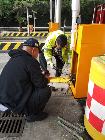 圖為工作人員對(duì)新欄桿機(jī)進(jìn)行接線