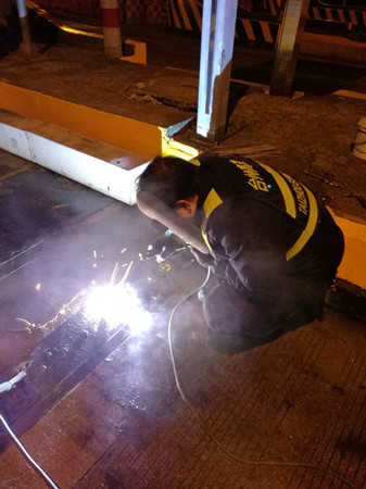 到了現(xiàn)場,隊員發(fā)現(xiàn)該車道輪檢器鐵板螺孔由于不斷摩擦并逐漸變大,導(dǎo)致整顆螺栓脫離底下固定螺座,加之當(dāng)天是春節(jié)高速免費第一天,車輛經(jīng)過時車速都較快,直接將整塊鐵板帶離底座。如果不及時對鐵板進行加工恢復(fù),不僅不能保護下面的輪檢器,而且還有可能造成車輛爆胎??沙σ谷考庸S都已關(guān)門,如果讓廠家發(fā)貨至少也要好幾天。正在兩難之際,中心副經(jīng)理葉俊想到將鐵板與底座邊緣直接焊死的臨時應(yīng)急方法,待節(jié)后再向廠家定制或重新購買。 方案有了,大家兵分兩組,一組去中心倉庫拿電焊機、電焊條等設(shè)備,一組待在原地清理鐵底下方於泥等雜物,為隨后的電焊工作做準(zhǔn)備。設(shè)備到位后,葉俊一手操起電焊罩,一手熟練的將電焊條點在了鐵板與底座邊緣之間,經(jīng)過近一個小時的處理,輪檢鐵板與地面底座牢牢地固定在一起,再也不用被飛馳而過的車輛帶離。 項寅曉