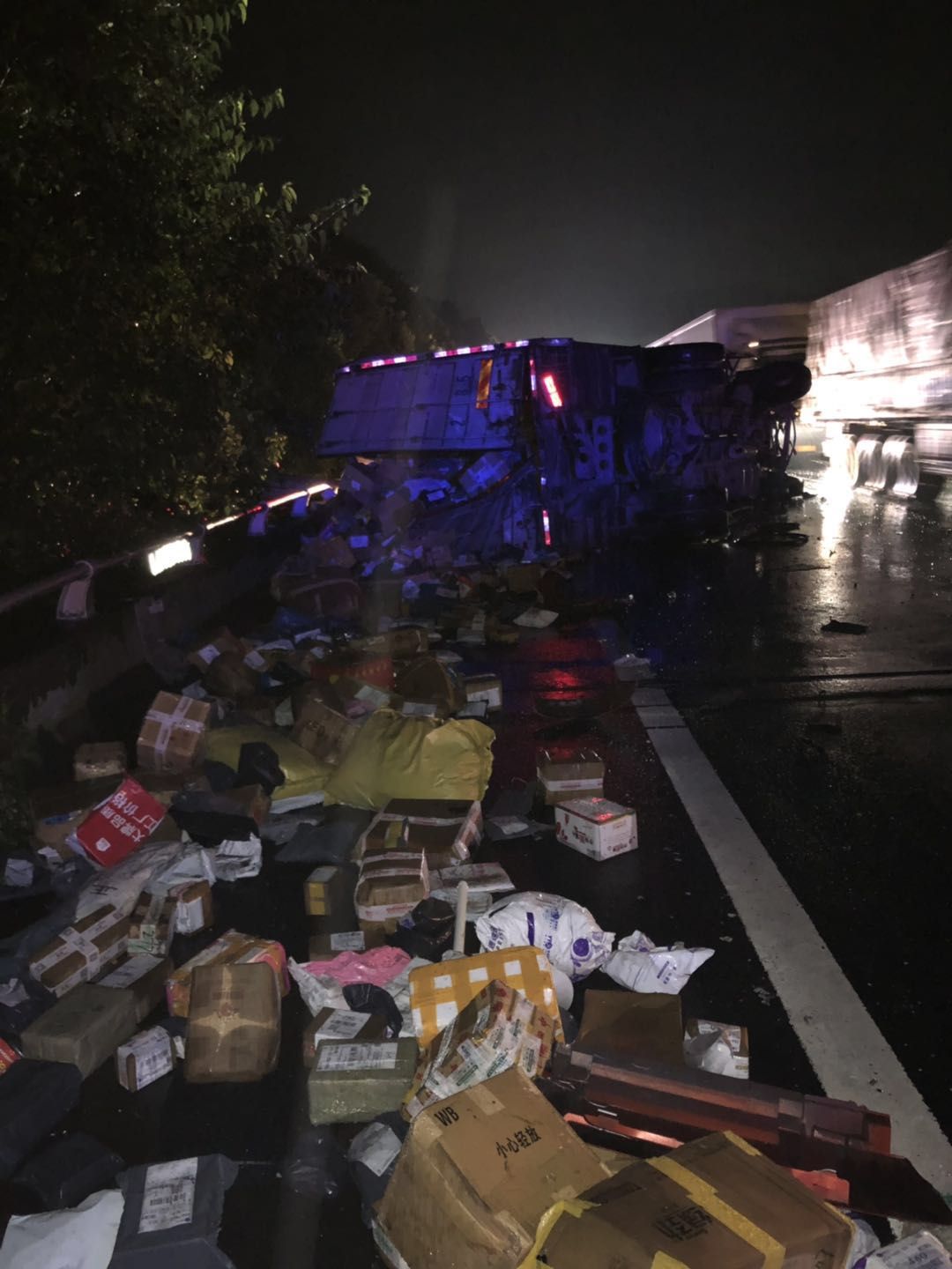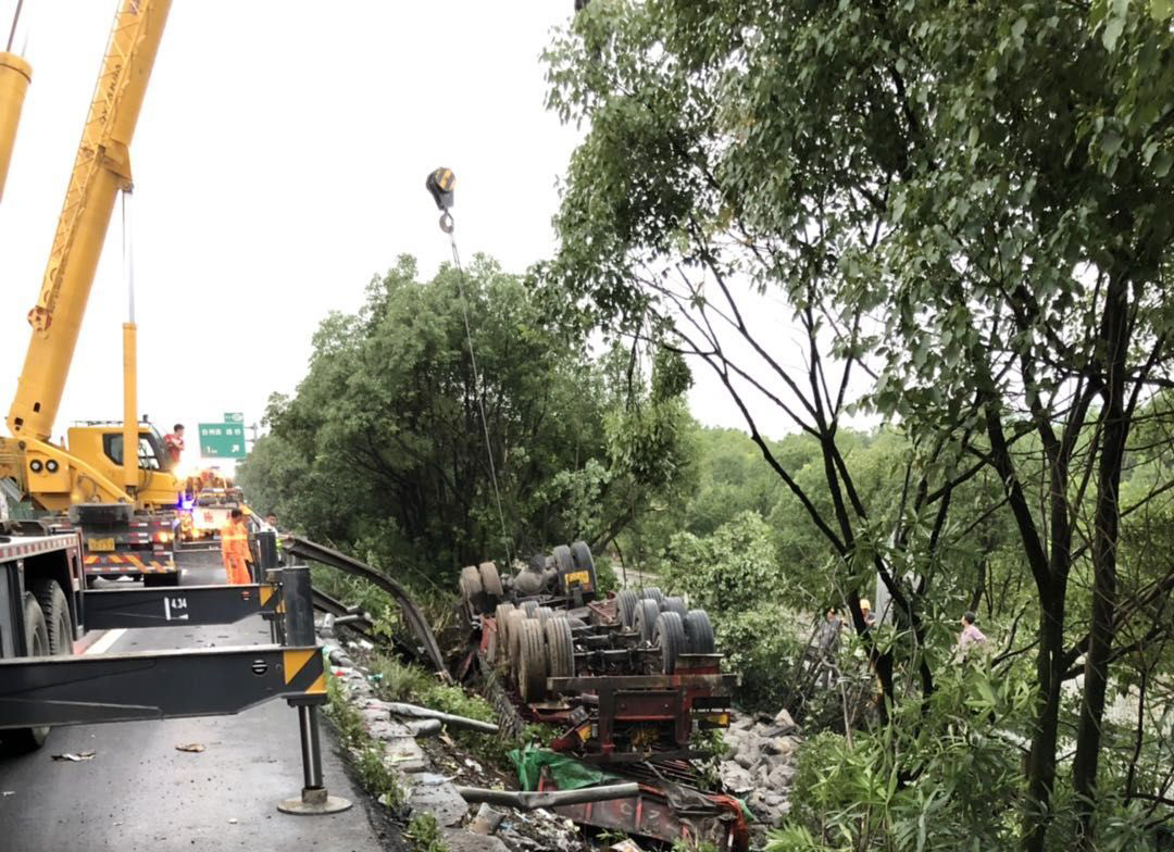 7月14日凌晨1點,溫州方向臺州南收費所附近,一輛半掛型大貨車和一輛快遞車相撞,半掛車直接沖出高速,四腳朝天??爝f車則是被巨大的沖擊力撞向了硬路肩,側(cè)翻中撒下數(shù)十米的貨物。1點10分,救援車輛到達(dá)現(xiàn)場,現(xiàn)場一片狼藉,防撞護(hù)欄板、護(hù)欄柱損傷嚴(yán)重,橋梁鋼管都折斷了不少。