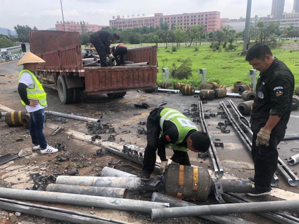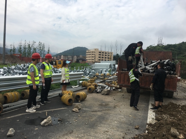 圖為各部門小組人員監(jiān)督現(xiàn)場(chǎng) 此次廢舊物資數(shù)量大,護(hù)欄板因高溫沖擊造成了強(qiáng)烈的扭曲變形,這無(wú)疑給裝載增加了難度。大家和裝載人員一起想辦法,以便更好地裝車安全抵達(dá)院橋磅秤站。盡管天氣燥熱、環(huán)境嘈雜,可絲毫未影響小組成員的工作熱情,因時(shí)間倉(cāng)促,所有人利用午休時(shí)間加快工作進(jìn)度,一直堅(jiān)守現(xiàn)場(chǎng)。在趁車裝載間隙,兵分兩路,一隊(duì)現(xiàn)場(chǎng)盯裝車,另一隊(duì)由林軍帶領(lǐng)趕往塘嶺廣場(chǎng)、臺(tái)州收費(fèi)所,對(duì)阻塊等廢舊物品進(jìn)行勘察,隨后又馬不停蹄趕往院橋磅秤站匯合監(jiān)督過(guò)磅環(huán)節(jié)。 直至下午5點(diǎn),大家終于結(jié)束工作。據(jù)統(tǒng)計(jì),此次共處理廢棄物資約15噸。 毛譯聆