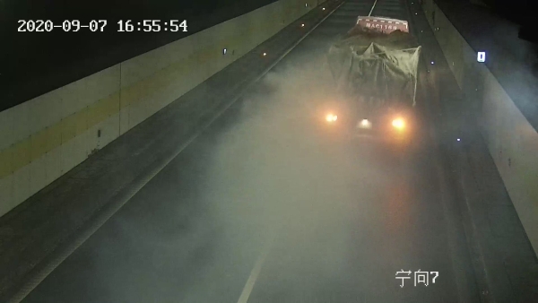 9月7日下午16點(diǎn)53分,一輛大貨車(chē)駛?cè)雽幭螯S土嶺隧道,打著雙閃燈,整車(chē)發(fā)散出濃濃的煙霧,造成隧道內(nèi)能見(jiàn)度極低。