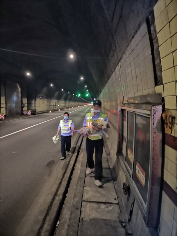 為確保安全,執(zhí)勤隊員們帶上手套,拿著掃把和麻袋,到達(dá)現(xiàn)場后發(fā)現(xiàn)是一只白色的拉布拉多犬,它一動不動地趴著,可憐巴巴地看著隧道里的車子極速而過,很顯然小狗感覺到害怕,知道趴在這里才是最安全的。隧道所安保人員陶文輝再三確認(rèn)小狗沒有攻擊意圖后,試著慢慢靠近它,給它喂食香腸,并耐心安撫,直至順利地將其抱起,帶上了巡邏車。狗是靈性的動物,認(rèn)準(zhǔn)了第一個抱起它的陶文輝,乖乖地依偎在他的懷里。 此前,隧道里從未出現(xiàn)寵物狗被遺忘的事,執(zhí)勤隊長忙回到監(jiān)控室查看錄像,準(zhǔn)備幫它尋找主人,經(jīng)過仔細(xì)查找終于發(fā)現(xiàn)隧道里有過一次大堵車,小狗就是那個時候被主人遺忘的。按照時間推算,這條小狗已經(jīng)在隧道里呆了近14個小時,還好它聰明,趴在那兒一動不動沒有到處亂跑。最后經(jīng)過半個多小時的查找,隊長終于與車主取得聯(lián)系,晚上22點左右,車主來到大溪嶺隧道所認(rèn)領(lǐng),多次感謝我們對小狗的救援和照顧。 孫鵬