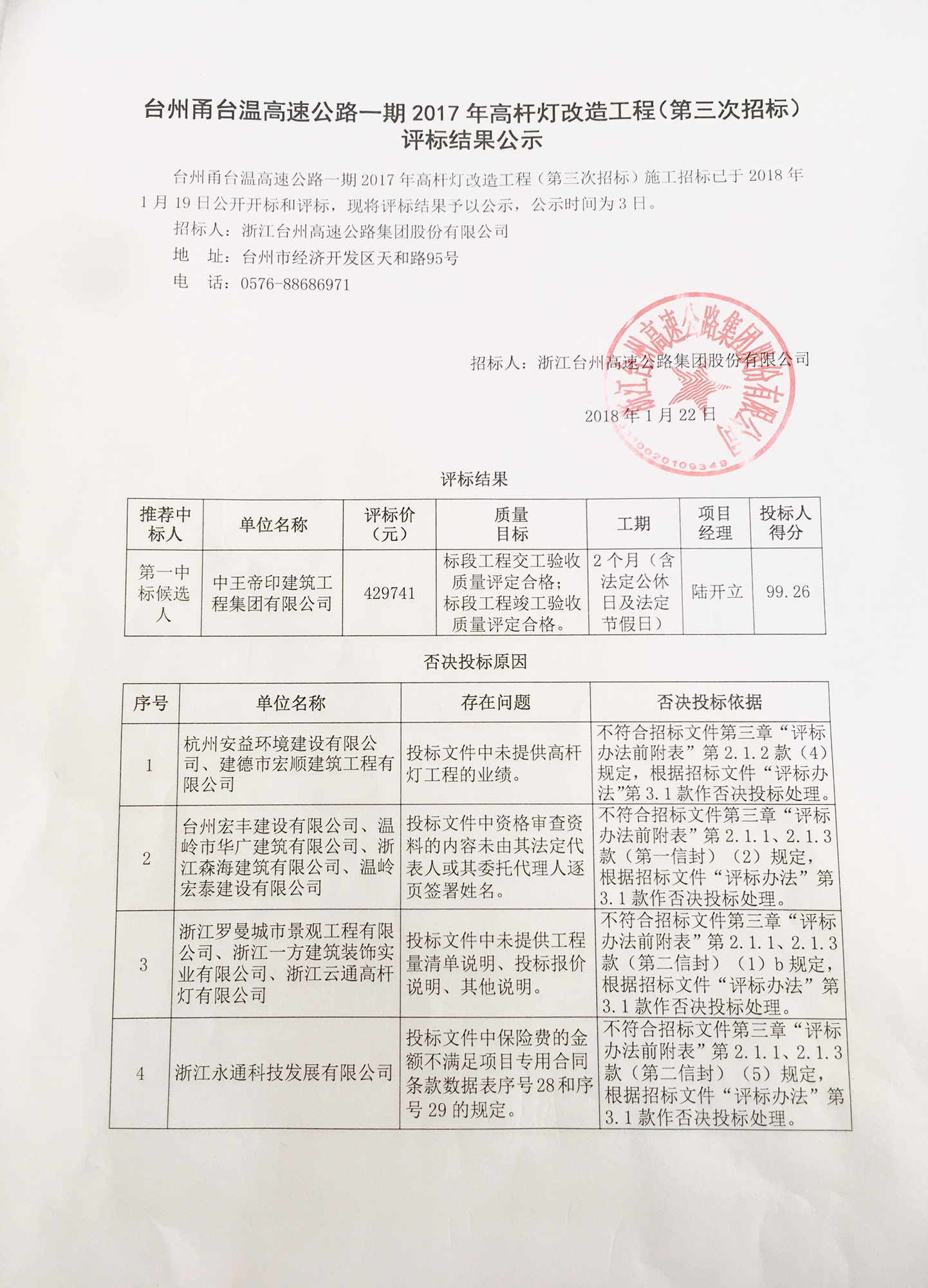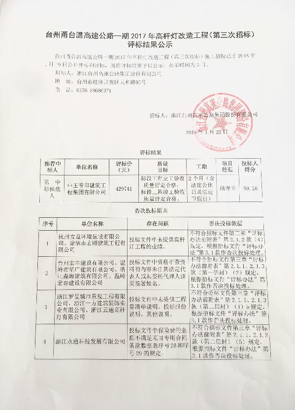 臺(tái)州甬臺(tái)溫高速公路一期2017年高桿燈改造工程(第三次招標(biāo))評(píng)標(biāo)結(jié)果公示
