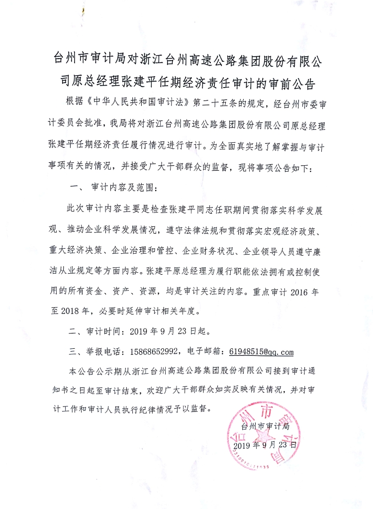 臺州市審計局對浙江臺州高速公路集團股份有限公司原總經(jīng)理張建平任期經(jīng)濟責任審計的審前公告
