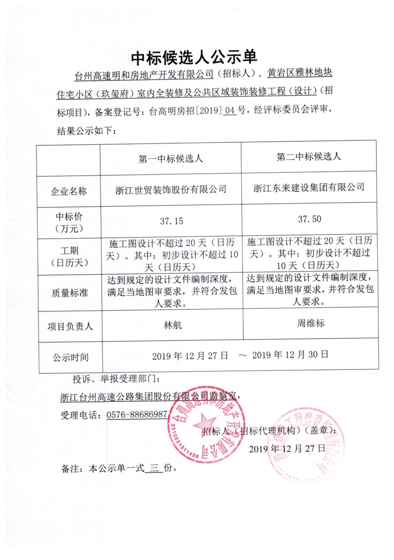 黃巖區(qū)雅林地塊住宅小區(qū)(玖璽府)室內(nèi)全裝修及公共區(qū)域裝飾裝修工程(設(shè)計)中標候選人公示單