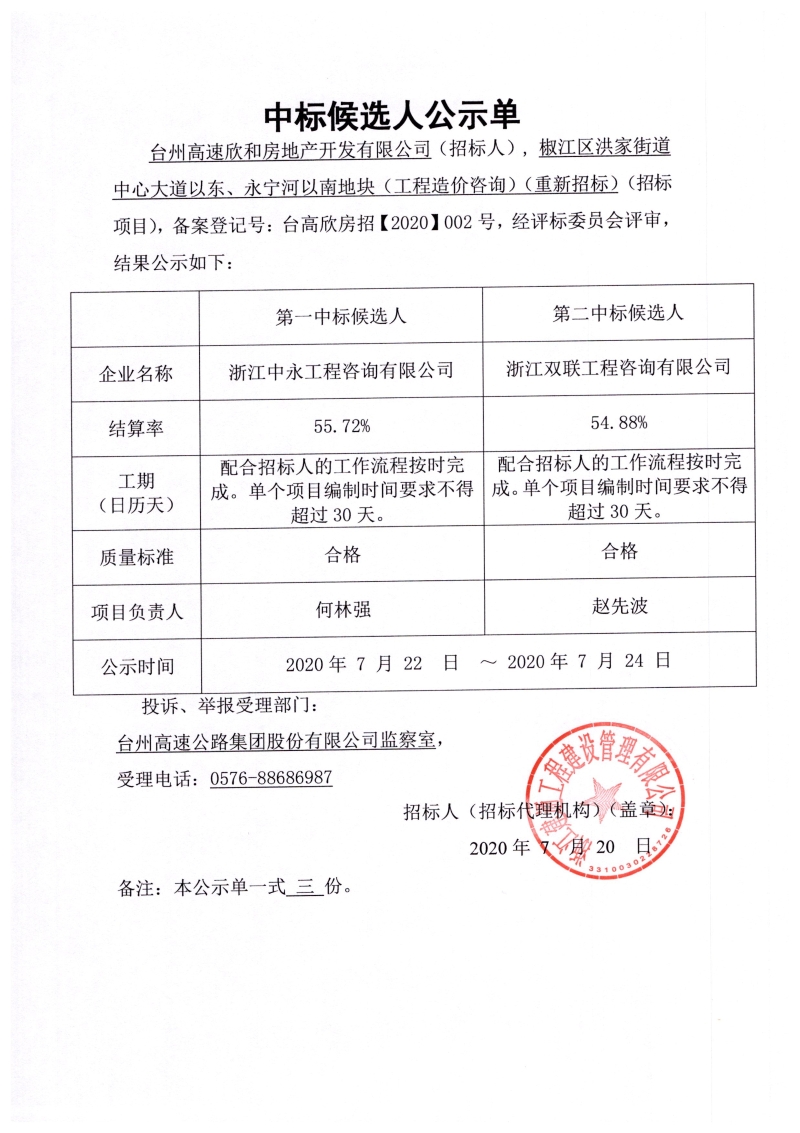 椒江區(qū)洪家街道中心大道以東、永寧河以南地塊(工程造價(jià)咨詢)中標(biāo)候選人公示單