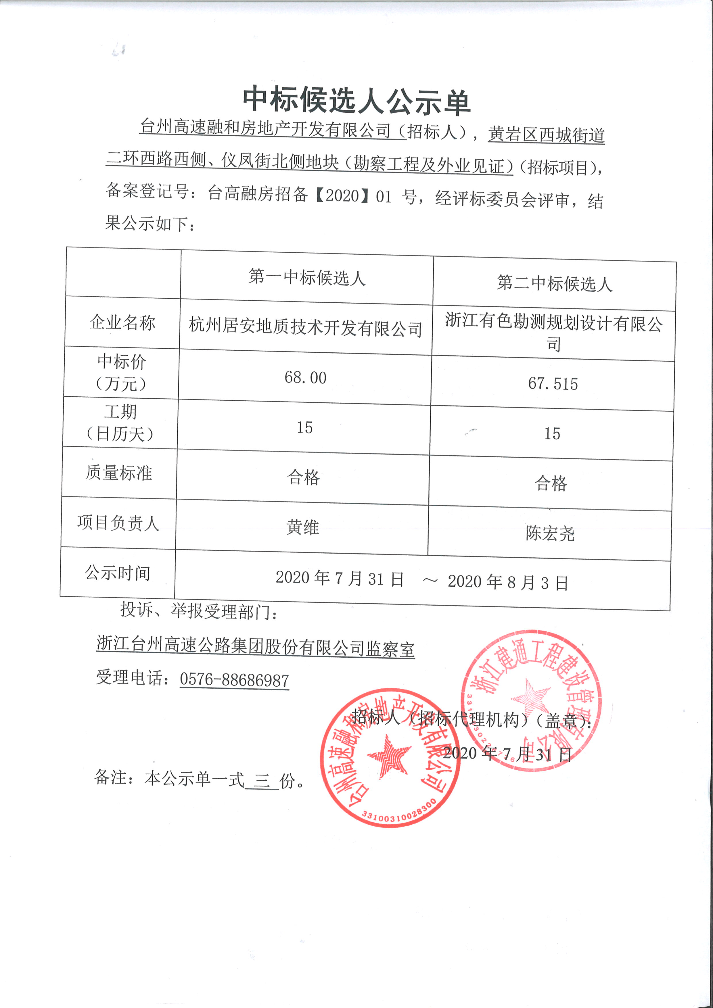 黃巖區(qū)西城街道二環(huán)西路西側(cè)、儀鳳街北側(cè)地塊(勘察工程及外業(yè)見證)中標(biāo)候選人公示單