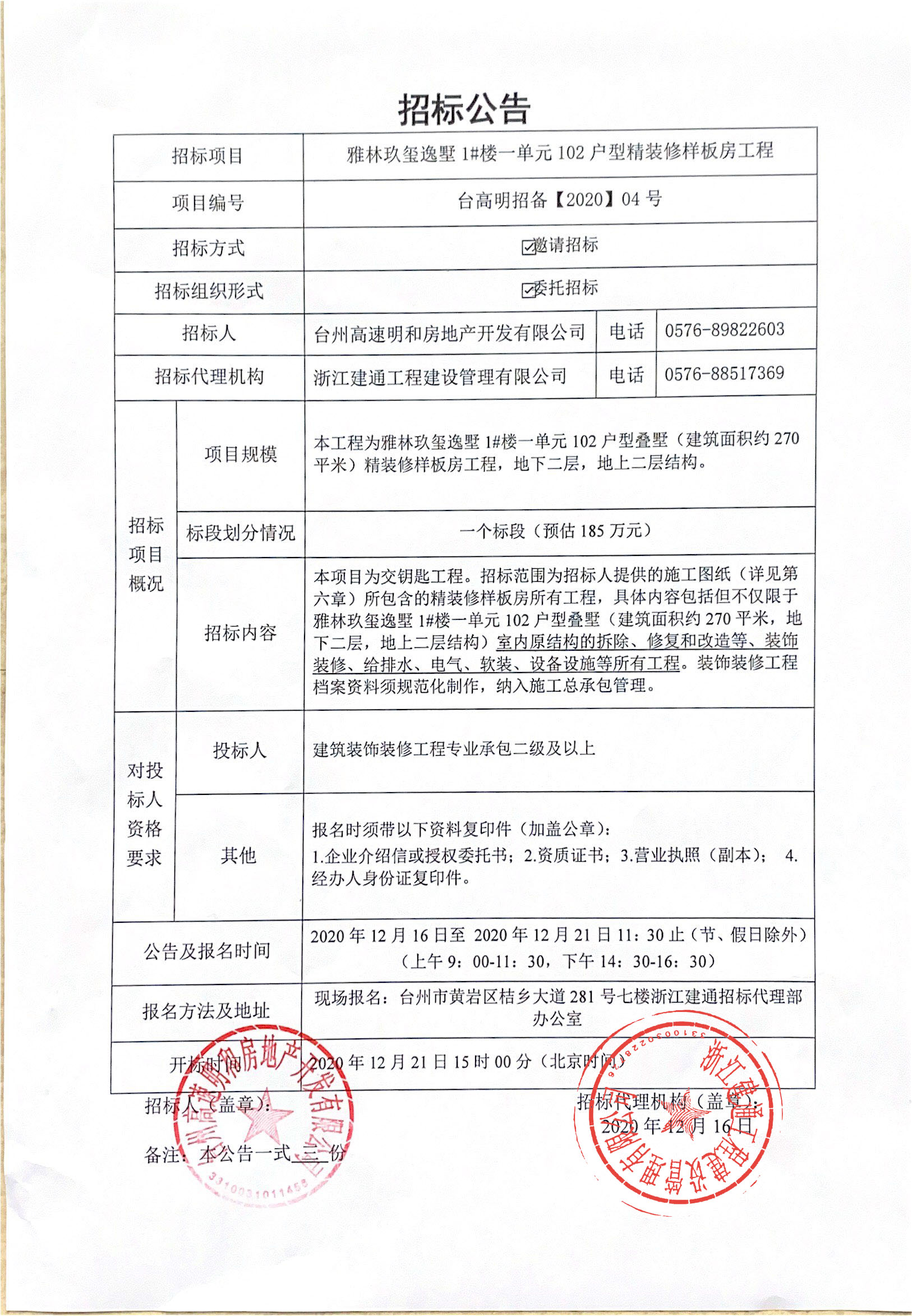 雅林玖璽逸墅1#樓一單元102戶(hù)型精裝修樣板房工程招標(biāo)公告