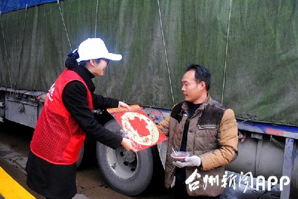 圖為志愿者為司機(jī)送上“?!弊?。鄭瑛芝攝