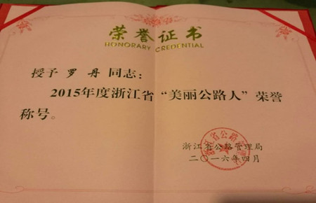 圖為羅丹獲得“美麗公路人”的榮譽(yù)證書