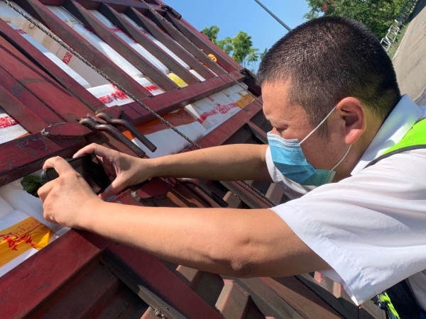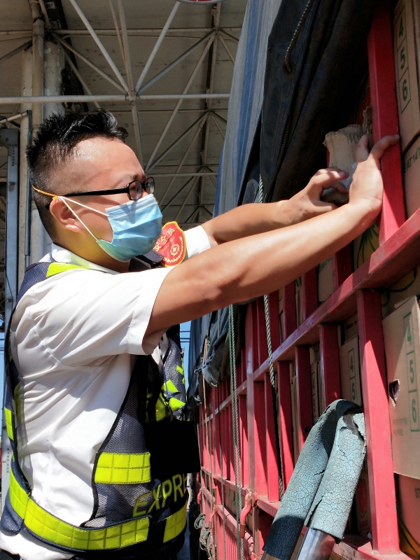 檢查綠農(nóng)車,遇到攀爬驗貨時,車輛欄桿因高溫炙烤至少在四五十度以上,臺州南收費所班長周冬子笑著說:現(xiàn)在的車欄桿都辣手了,腳底板也像踩了風(fēng)火輪。話音還未落,只見他蹭蹭幾下,已然爬上貨車,一邊檢查貨物一邊用袖子蹭掉臉上豆大的汗珠,被曬得黝黑發(fā)紅的皮膚在烈日下格外醒目。綠農(nóng)車開走后,他顧不上滿身汗水,拿起了掃把開始打掃灑落在車道上綠農(nóng)產(chǎn)品。因為他知道,這些灑落的農(nóng)產(chǎn)品,如不及時清理,在太陽曝曬后將會更加刺鼻,影響收費站的形象。