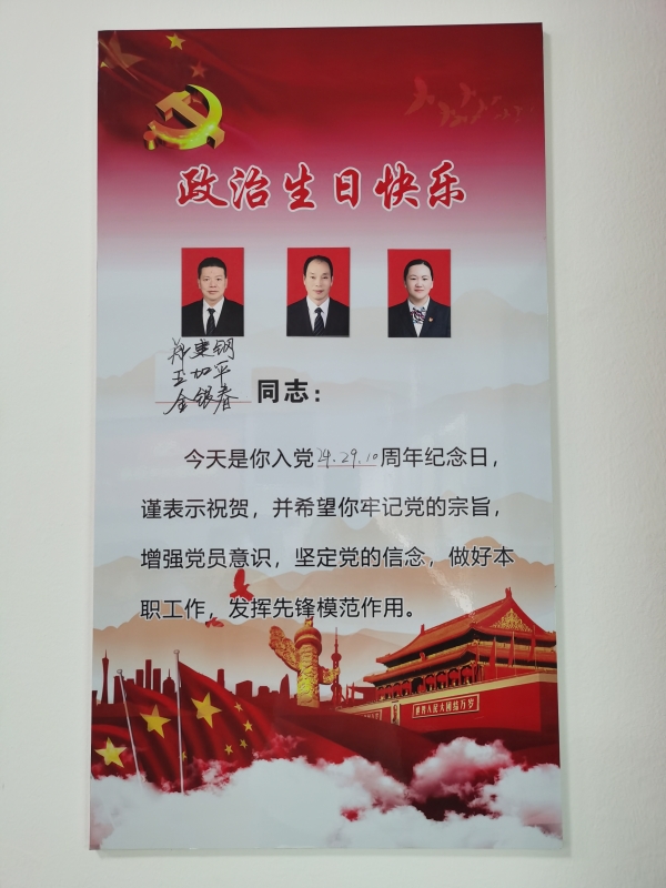 王加平、鄭建鋼分別是有著29年、24年黨齡的老黨員,他們向其他黨員分享了各自入黨以來的心路歷程,從工作中的細微處做起,深刻檢討自己在發(fā)揮黨員先鋒模范作用上做的不足之處,激勵和鞭策自己。他們一句句質(zhì)樸的語言,讓我們走進了他們的生活,感受了他們不忘初心的激情歲月。在活動過程中,支委成員為過生日黨員贈送了賀卡。