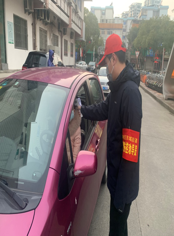 黨員丁聰,積極參與泰和苑小區(qū)的卡點測溫志愿服務;